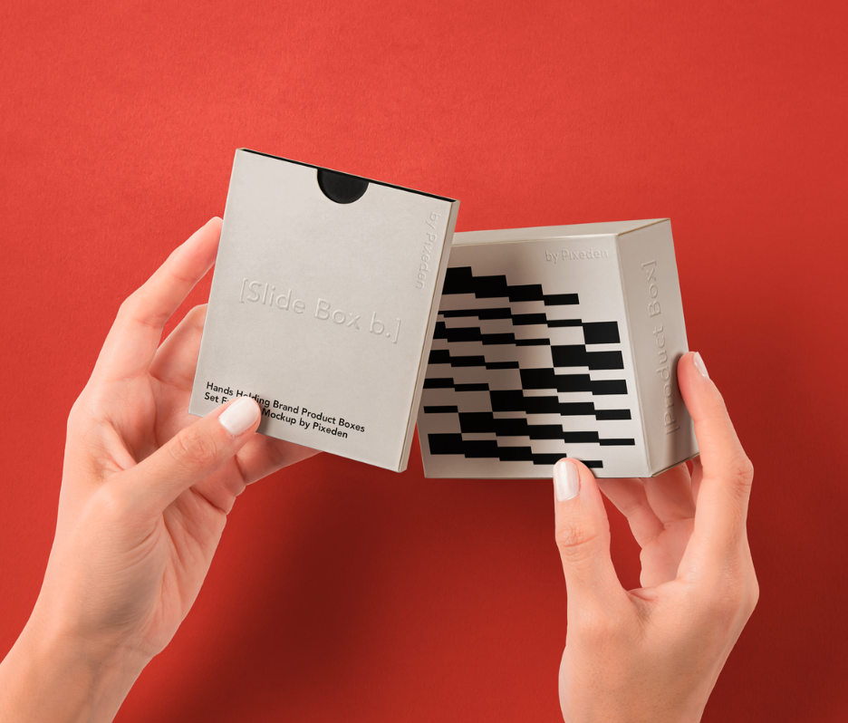 Hands Holding Brand Product Boxes Set PSD Mockup