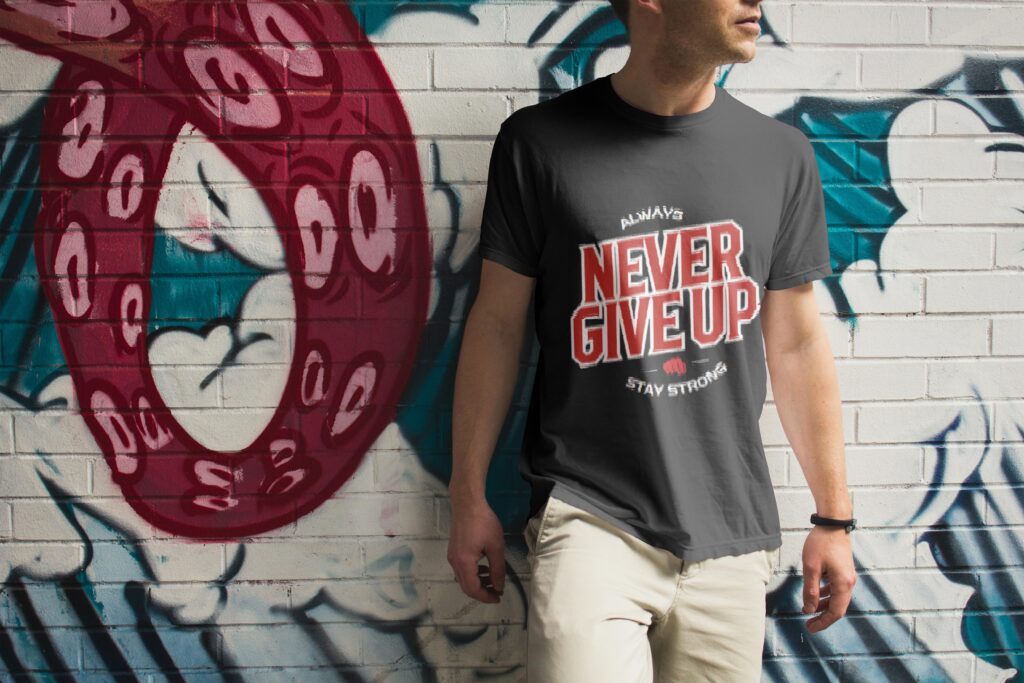 This mockup has a big t-shirt on a simple wall. Great for bold designs and streetwear brands.