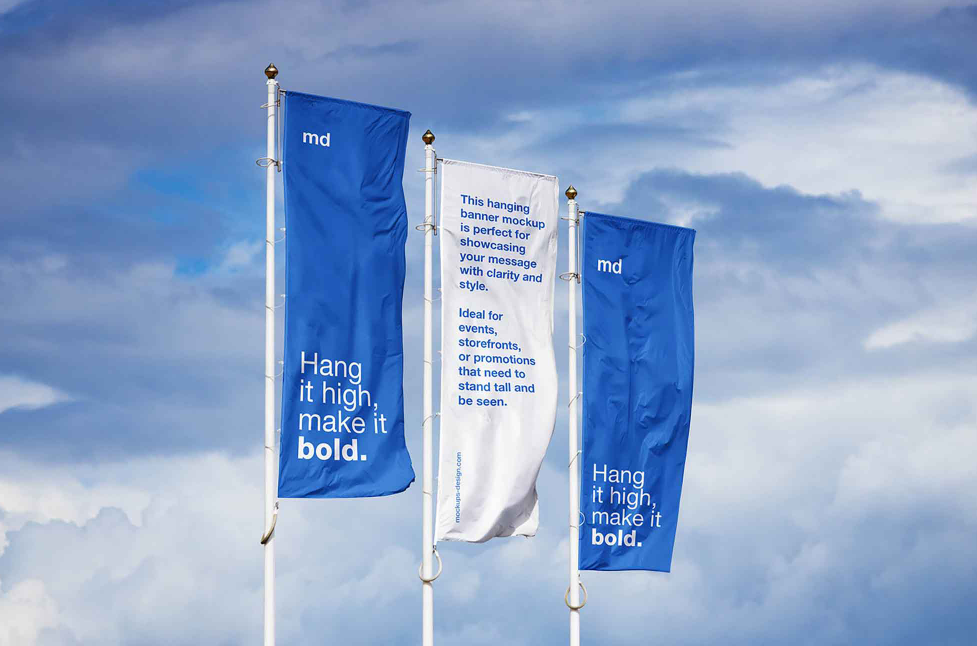 Show your branding designs in a realistic and eye catching way with this Free Outdoor Flag Mockup. It features three tall flags waving in the wind against a bright blue sky giving your designs a natural and dynamic look. This mockup is great for showing off logos event graphics or promotional designs for businesses sports or festivals.