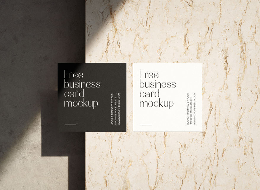 Designed exclusively for Mockups Design this PSD mockup features square format business cards displayed in a clean and modern setting. The realistic marble texture adds depth and refinement while the sharp lighting enhances the visual contrast and brings your design to life.